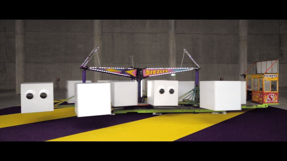 Curated by Gill Minervini, the work features an endless funfair ride - a dream for the young but a nightmare for the old.